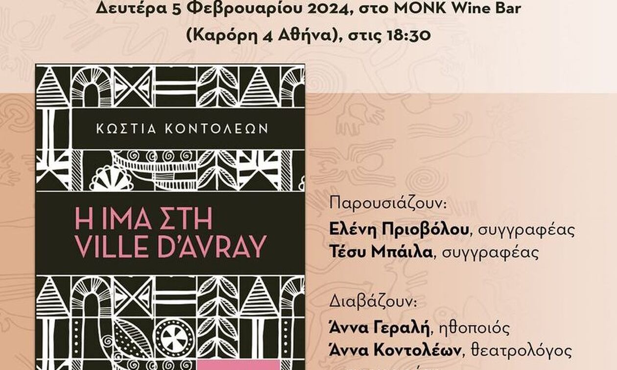 Η Κώστια Κοντολέων καταπιάνεται με το λόγο και την αφήγηση πολλά χρόνια τώρα. Είτε από το μετερίζι της μετάφρασης είτε από τη θέση της δημιοργού μας έχει δώσει αξιόλογα έργα. Η συλλογή διηγημάτων H IMA στη Ville d' Auvray που μόλις κυκλοφόρησε από τις εκδόσεις Στιγμός θα παρουσιαστεί στο MONK wine bar (Κοκόρη 4, Αθήνα) στις 6.30 το απόγευμα, τη Δευτέρα 5 Φεβρουαρίου.