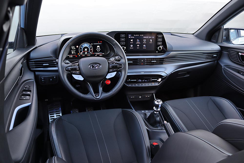 Ετοιμοπόλεμο είναι και το εσωτερικό του, όπου ο οδηγός «αγκαλιάζεται» από το πάρα πολύ καλό σε στήριξη και άνετο τύπου μπάκετ κάθισμα με το ενιαίο προσκέφαλο. Στη διάθεσή του έχει ακόμα το δερμάτινο τιμόνι με την παχιά στεφάνη, τον ενσωματωμένο διακόπτη N αριστερά για την επιλογή των προφίλ οδήγησης και το δεξί πλήκτρο N για την ενεργοποίηση του σπορ προγράμματος N και των εξατομικευμένων σεταρισμένων N Custom. Όσο για το κόκκινο μπουτόν θέτει σε λειτουργία ή όχι το Rev Matching, για να συγχρονίζει τις στροφές του κινητήρα κατά το κατέβασμα των ταχυτήτων.