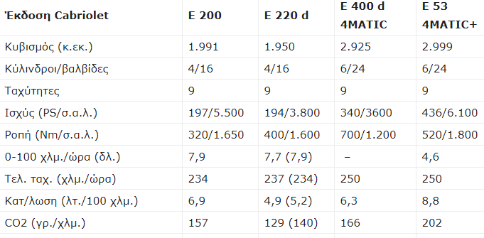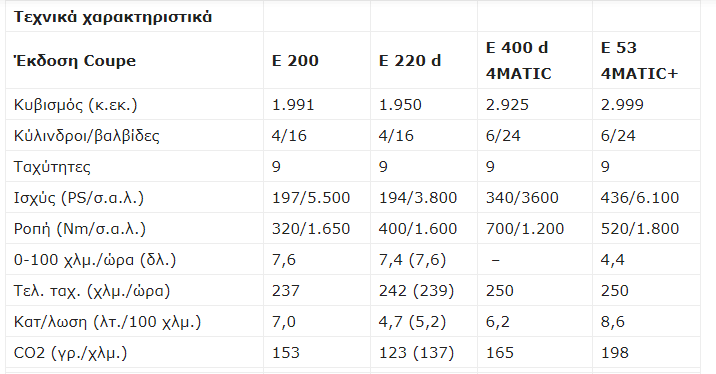 Στους πετρελαιοκινητήρες, οι E 220 d φορούν τον 2λιτρο των 194 ίππων και 400 Nm ροπής, με τις E 400 d να ανεβαίνουν στα 340 άλογα και 700 Nm από τον 3λιτρο κινητήρα. Όλες οι E-Class Coupe και Cabrio συνδυάζονται με το 9άρι αυτόματο κιβώτιο 9G-TRONIC. Ακολουθούν οι αναλυτικοί πίνακες επιδόσεων και τεχνικών χαρακτηριστικών της Mercedes.