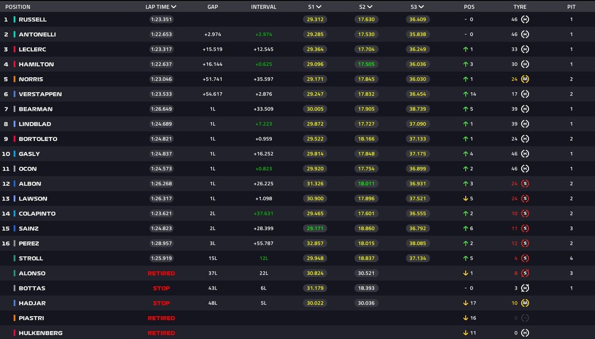 Ο Τζορτζ Ράσελ από μια αρκετά ενδιαφέρουσα μάχη με τη Ferrari και τον Σαρλ Λεκλέρ στο πρώτο μισό του αγώνα, κατάφερε να κατακτήσει τη νίκη, ενώ δεύτερος τερμάτισε ο Κίμι Αντονέλι, ο οποίος είχε εκκινήσει έβδομος.