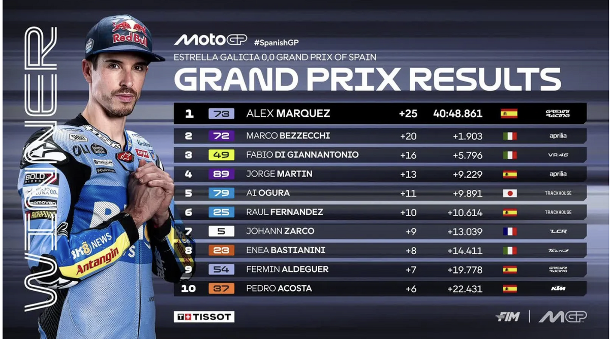 Μετά την Σαββατιάτικη νίκη του (επτάκις παγκόσμιου πρωταθλητή) Μαρκ Μάρκεθ στον αγώνα σπριντ και την πρωτιά του στις κατατακτήριες δοκιμές, το κυριακάτικο (26/04) γκραν πρι της Χερέθ ήταν υπόθεση του, μικρότερου αδερφού του, Άλεξ (Ντουκάτι), που κέριδισε για 2η σερί χρονικά στην ισπανική πίστα!