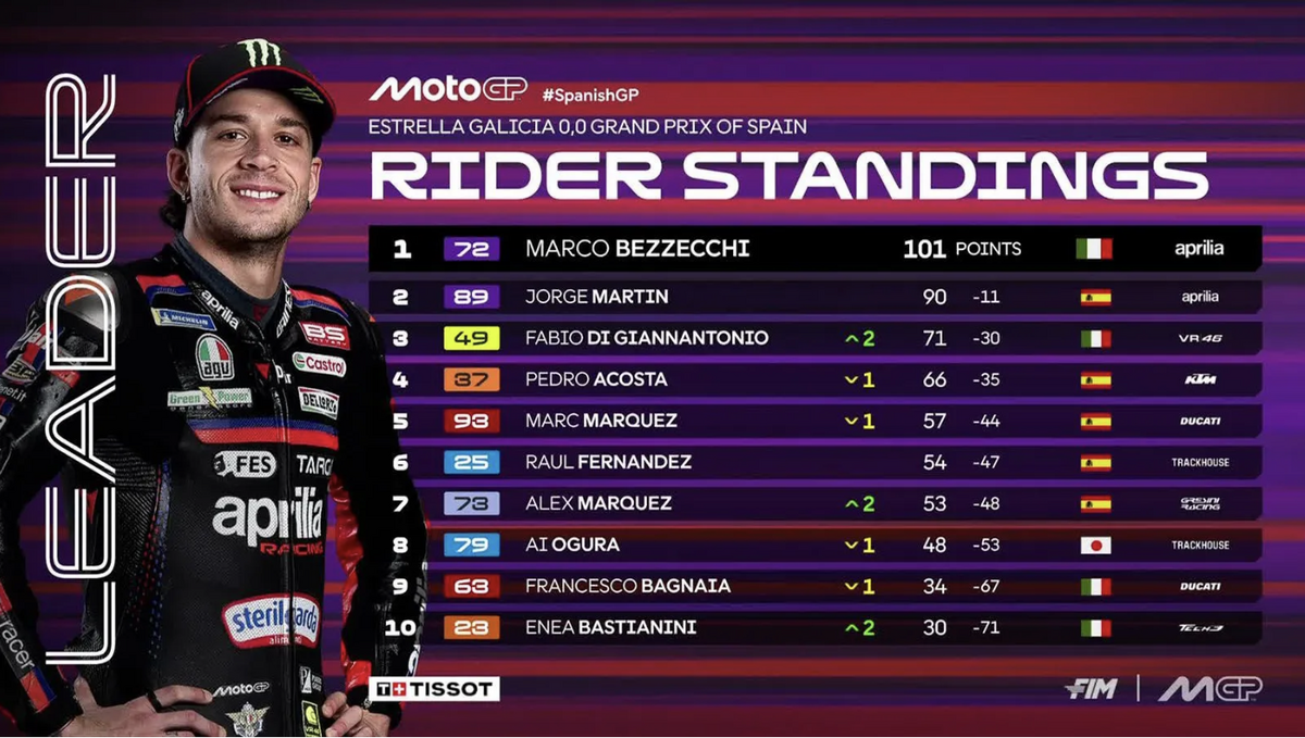 Ο Καταλανός αναβάτης (παρότι ξεκίνησε 5ος) εκμεταλλεύθηκε την πτώση και εγκατάλειψη του αδερφού του πρωτεύοντας κι αφήνοντας 2ο τον (επικεφαλής της βαθμολογίας) Μάρκο Μπετζέκι (Απρίλια). Τρίτος ο Ντι Τζιαναντόνιο (Ντουκάτι).
