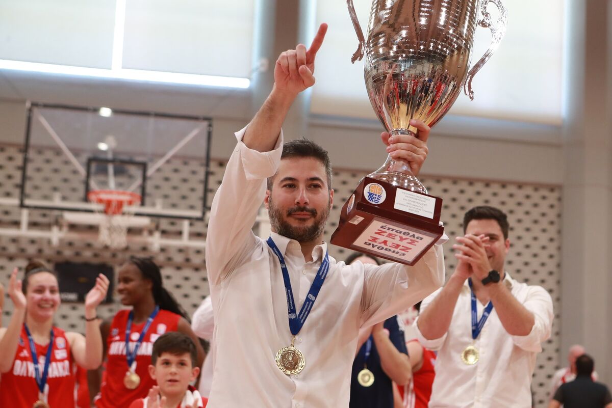 Η απονομή του πρωταθλήματος Ελλάδας στις παίκτες του Ολυμπιακού, μετά τη νίκη με 61-45 επί του Παναθηναϊκού.
