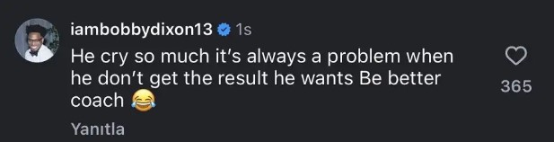 Ο άλλοτε παίκτης της Φενέρμπαχτσε και νατουραλιζέ γκαρντ της εθνικής Τουρκίας έγραψε στα social media: «Κλαίει πολύ. Πάντα είναι πρόβλημα όταν δεν παίρνει το αποτέλεσμα που θέλει. Πρέπει να γίνει καλύτερος κόουτς».