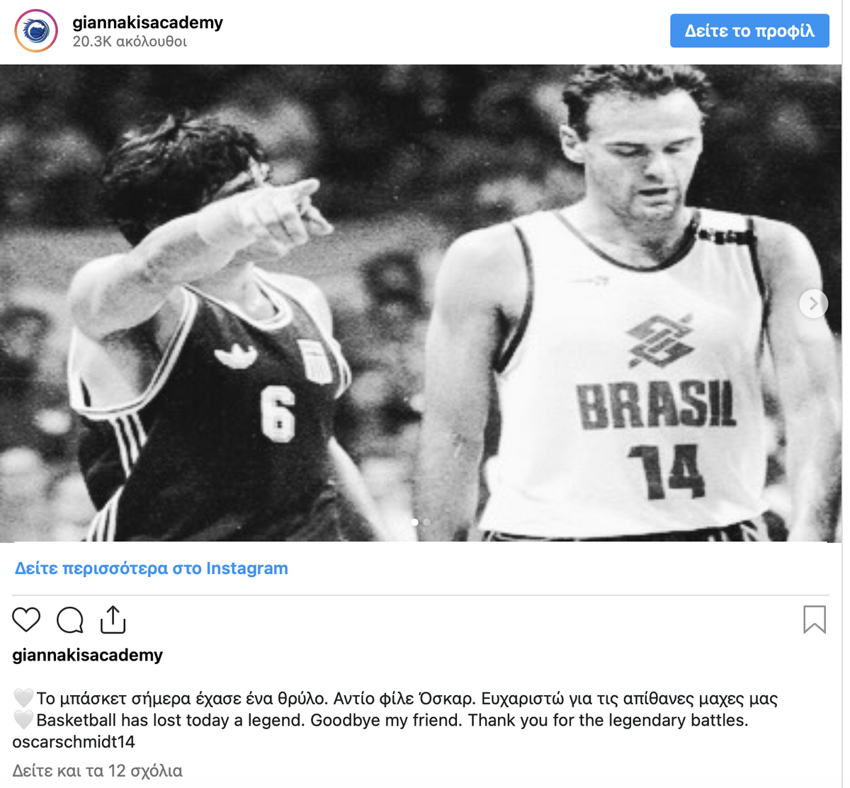 «Το μπάσκετ σήμερα έχασε ένα θρύλο. Αντίο φίλε Όσκαρ. Ευχαριστώ για τις απίθανες μάχες μας», έγραψε ο «δράκος» της ελληνικής καλαθόσφαιρας.