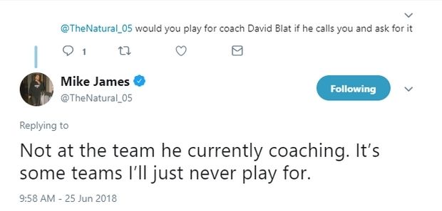 Συγκεκριμένα έγραψε για τον εάν σκέφτεται να συνεργαστεί με τον Μπλατ: "Όχι στην ομάδα που είναι τώρα. Είναι κάποιες ομάδες για τις οποίες δεν θα έπαιζα ποτέ".