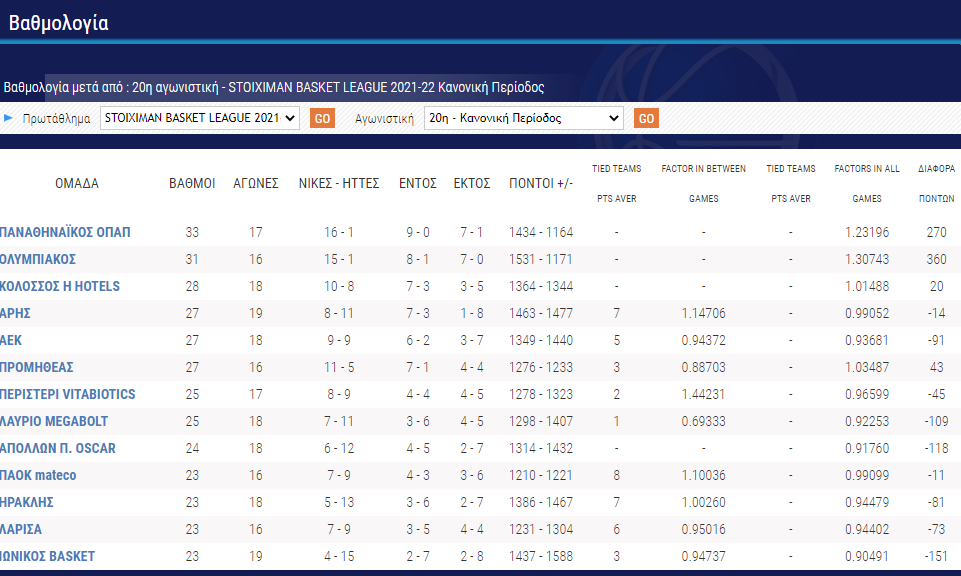 Στις 20:00 (ΕΡΤ 3), το Περιστέρι (8-9) υποδέχεται την Λάρισα (7-9) με στόχο να επιστρέψει στις νίκες μετά την ήττα της προηγούμενης αγωνιστικής από τον Ολυμπιακό.