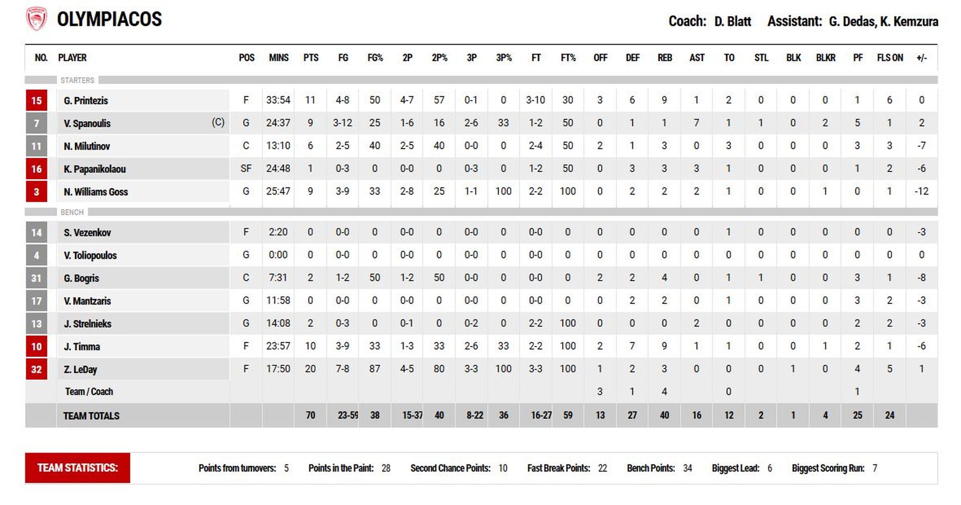 ΟΛΥΜΠΙΑΚΟΣ (Μπλατ): Πρίντεζης 11 (4/7 δίποντα, 3/10 βολές, 9 ριμπάουντ, 1 ασίστ σε 33:54), Σπανούλης 9 (1/6 δίποντα, 2/6 τρίποντα, 7 ασίστ, 1/2 β, σε 24:37), Μιλουτίνοβ 6, Παπανικολάου 1, Γουίλιαμς-Γκος 9 (1), Βεζένκοβ, Μπόγρης 2, Μάντζαρης, Στρέλνιεκς 2, Τίμα 10 (1/3 δίποντα, 2/6 τρίποντα, 9 ριμπάουντ), ΛεΝτέι 20 (4/5 δίποντα, 3/3 τρίποντα, 3/3 βολές)