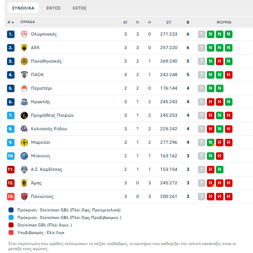 Τα αποτελέσματα και η βαθμολογία στη GBL
