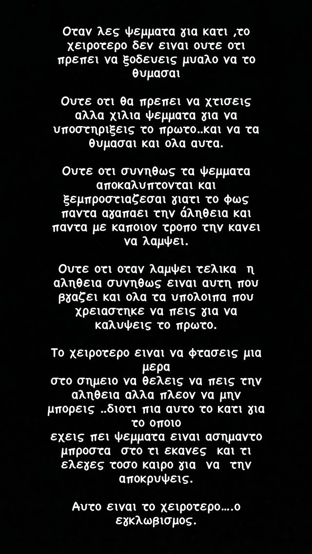 Το χειρότερο είναι να φτάσεις μια μέρα στο σημείο να θέλεις να πεις την αλήθεια αλλά πλέον να μην μπορείς. διότι πια αυτό το κάτι για το οποίο έχεις πει ψέματα είναι ασήμαντο μπροστά στο τι έκανες και τι έλεγες τόσο καιρό για να την αποκρύψεις.