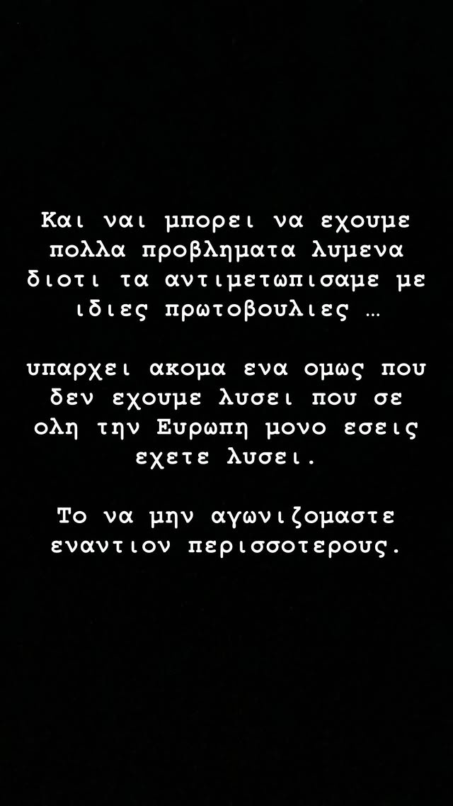 «Και ναι μπορεί να έχουμε πολλά προβλήματα λυμένα διότι τα αντιμετωπίσαμε με ίδιες πρωτοβουλίες... Υπάρχει ακόμα ένα όμως που δεν έχουμε λύσει, που σε όλη την Ευρώπη μόνο εσείς έχετε λύσει. Το να μην αγωνιζόμαστε εναντίον περισσότερους».