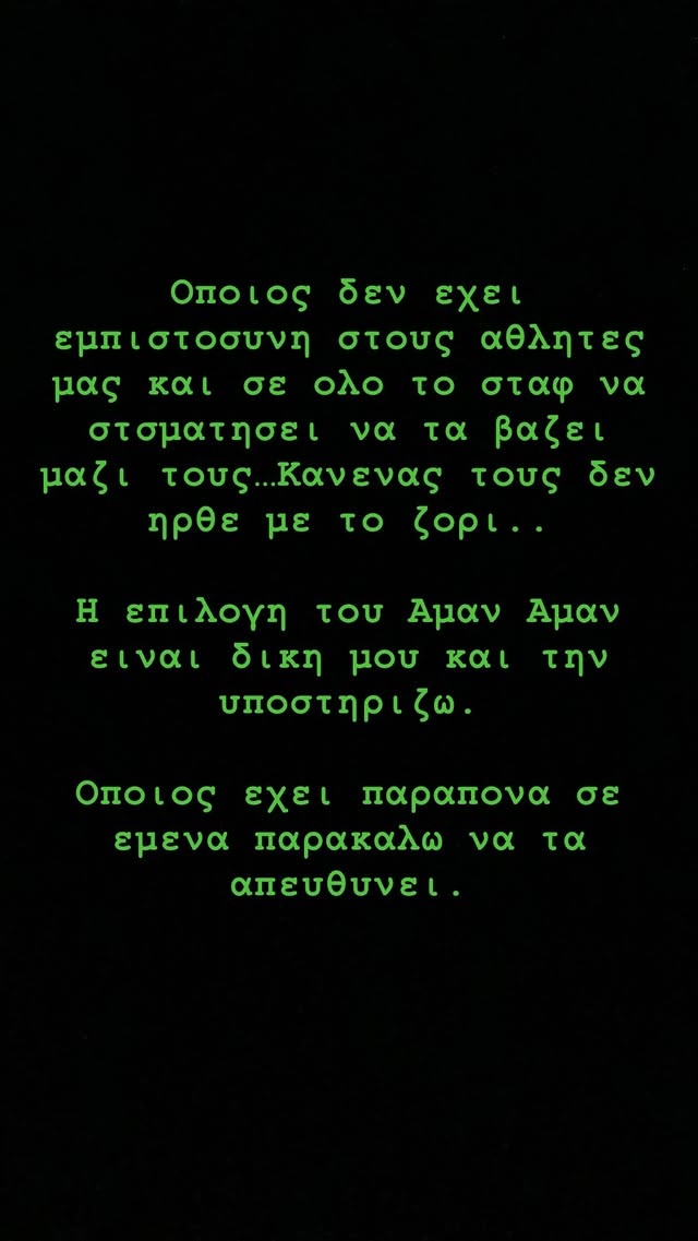 «Όποιος δεν έχει εμπιστοσύνη στους αθλητές μας και σε όλο το σταφ να σταματήσει να τα βάζει μαζί τους... Κανένας τους δεν ήρθε με το ζόρι... Η επιλογή του Αμάν Αμάν είναι δική μου και την υποστηρίζω. Όποιος έχει παράπονα σε εμένα παρακαλώ να τα απευθύνει».