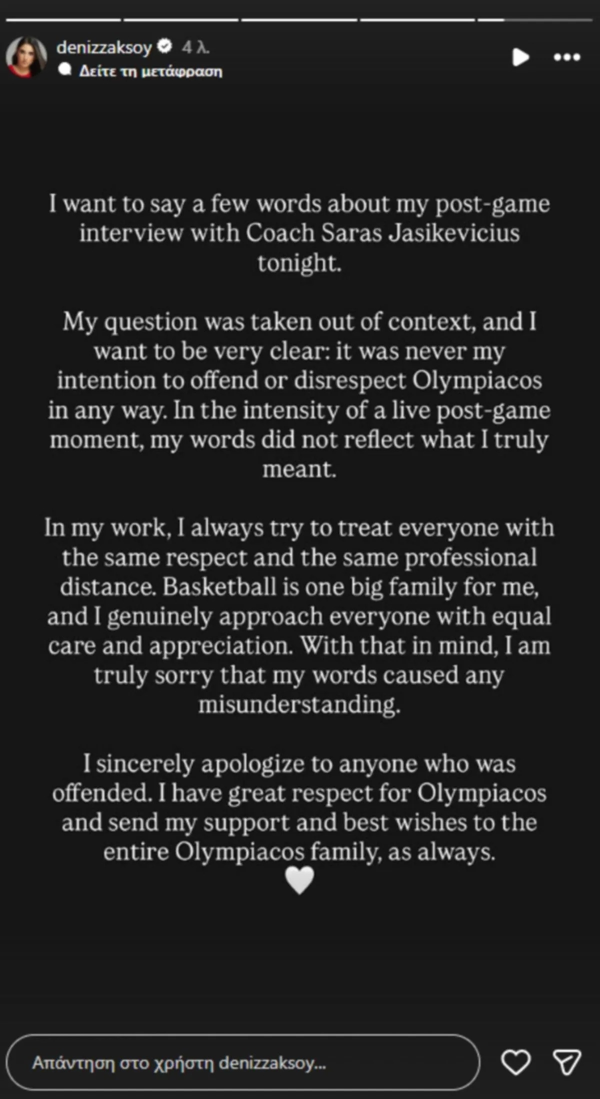 «Θέλω να πω μερικά πράγματα για τη συνέντευξη με τον Σαρούνας Γιασικεβίτσιους. Θέλω να είμαι ξεκάθαρη: Δεν είχα ποτέ πρόθεση να επιτεθώ στον Ολυμπιακό ή να τον προσβάλω, με οποιονδήποτε τρόπο. Στην ένταση μια ζωντανής στιγμής μετά από έναν αγώνα, τα λόγια μου δεν αντικατοπτρίζουν αυτό που πραγματικά εννοούσα.