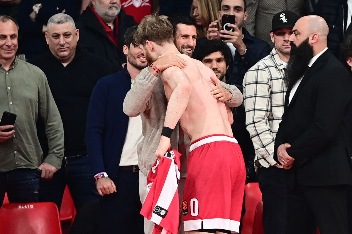 Όπως συμβαίνει πάντα μετά τα παιχνίδι του Ολυμπιακού με τον Ερυθρό Αστέρα οι παίκτες των δύο ομάδων πήγαν στην κερκίδα και γνώρισαν την αποθέωση από τους φίλους των Πειραιωτών.