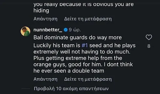 «Οι γκαρντ που κυριαρχούν στο παιχνίδι κάνουν πολύ περισσότερα. Για καλή του τύχη η ομάδα του είναι το νούμερο 1 στη βαθμολογία και παίζει εξαιρετικά, χωρίς να χρειάζεται να κάνει πολλά.