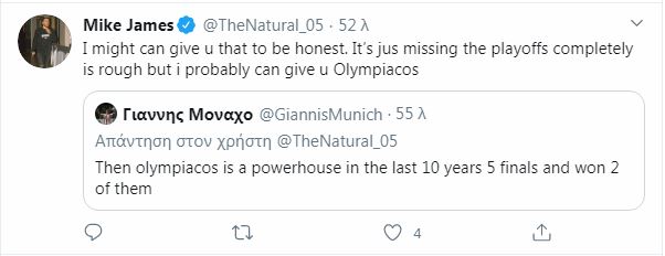 Ένας φίλος του Ολυμπιακού, του απάντησε αμέσως, πως «με πέντε Final 4 και δύο τίτλους την τελευταία 10ετία, ο Ολυμπιακός είναι στην ίδια κατηγορία», με τον Μάικ Τζέιμς να ανασκουμπώνετε «Ίσως να το δεχτώ αυτό για να είμαι ειλικρινής. Όμως το να μένεις εκτός πλέι οφ είναι σκληρό».