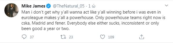 Ο Μάικ Τζέιμς προκάλεσε και πάλι στο twitter, με φίλους του Ολυμπιακού και του Παναθηναϊκού να του απαντούν.