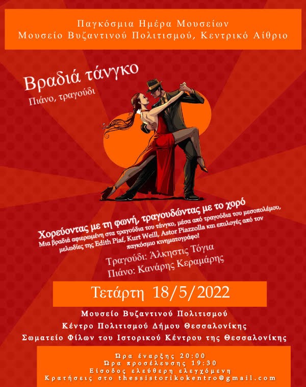 Την Τετάρτη 18/5/2022 τιμάται η Παγκόσμια Ημέρα Μουσείων στο κεντρικό αίθριο του Μουσείου Βυζαντινού Πολιτισμού, με την εκδήλωση “Βραδιά τάνγκο”.