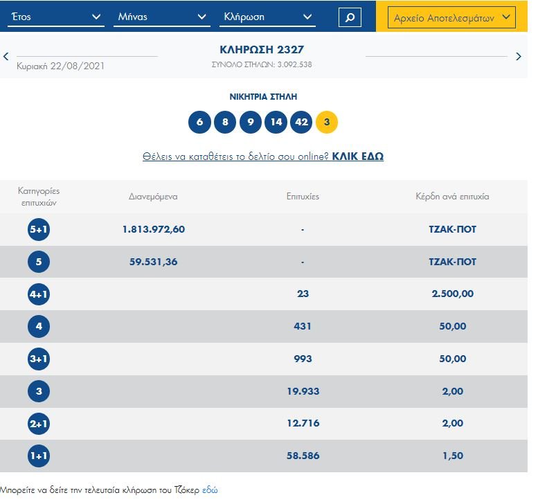 Οι τυχεροί αριθμοί που έβγαλε η κληρωτίδα είναι οι: 6, 8, 9, 14, 42 και Τζόκερ ο αριθμός 3.