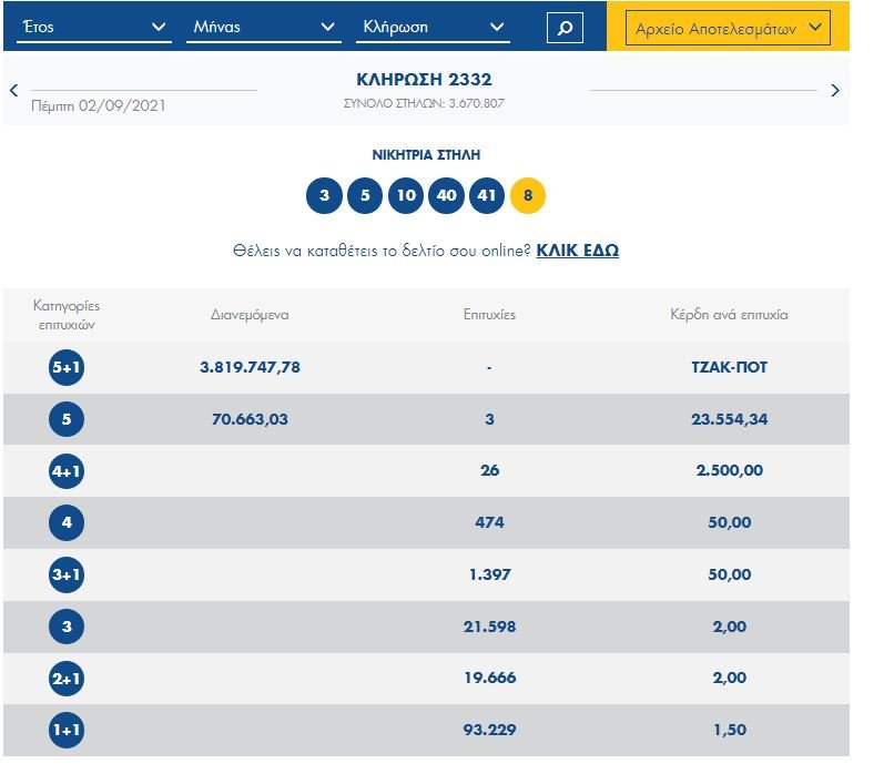 Οι τυχεροί αριθμοί της σημερινής κλήρωσης είναι οι: 3, 5, 10, 40, 41 και αριθμός Τζόκερ το 8.