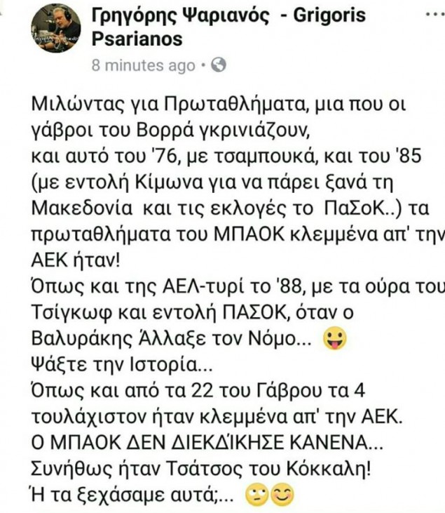 Στην ανάρτησή του, λοιπόν έγραψε: «Μιλώντας για Πρωταθλήματα, μια που οι γάβροι του Βορρά γκρινιάζουν, και αυτό του '76, με τσαμπουκά, και του '85 (με εντολή Κίμωνα για να πάρει ξανά τη Μακεδονία και τις εκλογές το ΠαΣοΚ..) τα πρωταθλήματα του ΜΠΑΟΚ κλεμμένα απ' την ΑΕΚ ήταν!