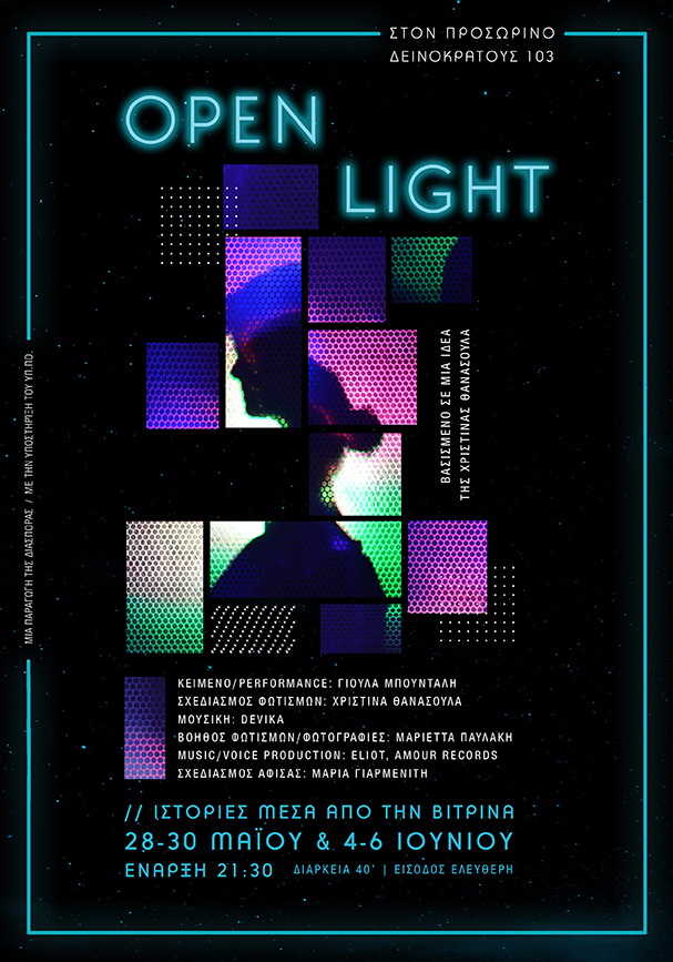 Το Open Light είναι ένα πείραμα. Αυτοτελείς εικόνες ξεπροβάλουν μέσα από μια δυναμική βιτρίνα, όπου φως, μουσική, ήχοι και λέξεις δημιουργούν έναν σκηνικό τόπο υπερέκθεσης, κατανάλωσης και έκφρασης τοπίων δημόσιων και ιδιωτικών.