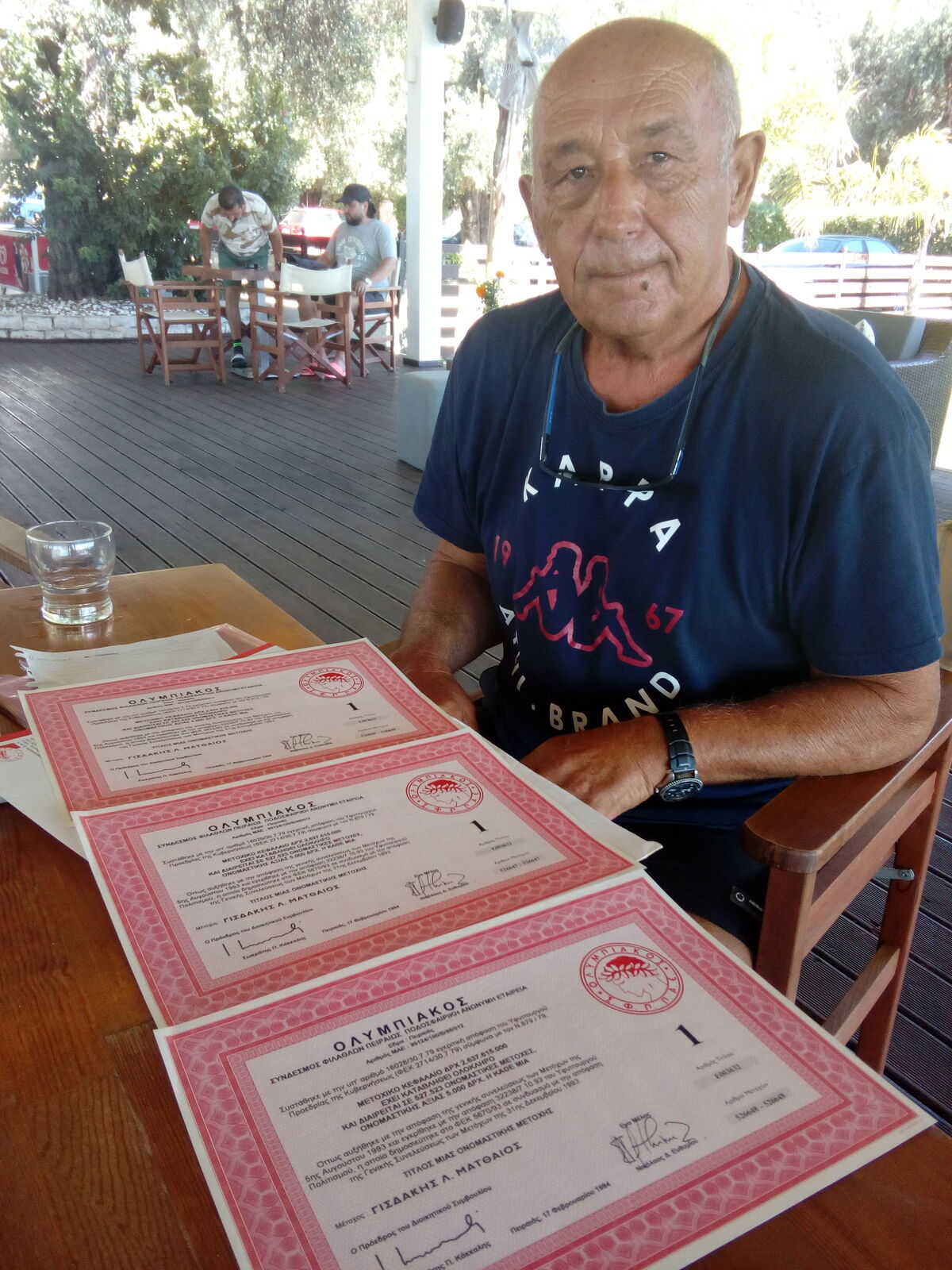 Να σου δείξω 3 μετοχές που είχα πάρει του Ολυμπιακού! Είναι δώρο μία για κάθε μου παιδί. Θα τις αφήσω κληρονομιά ως ενθύμιο. Τρέμει το χέρι μου από τη συγκίνηση τώρα που τις πιάνω.