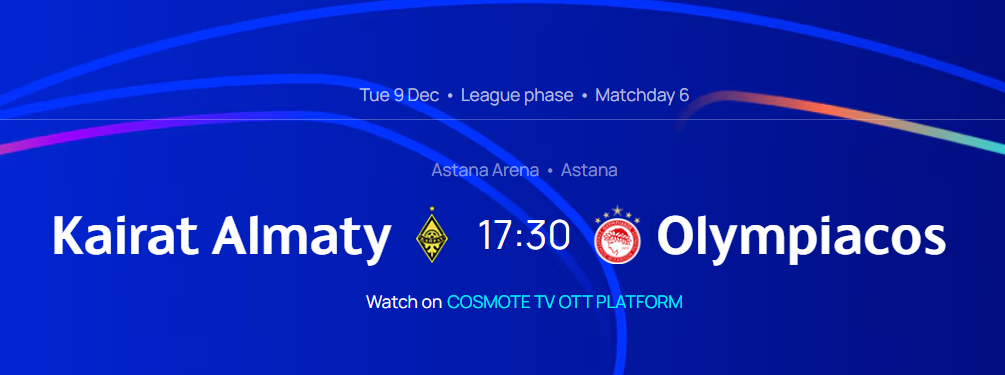 Όπως πλέον γράφεται κι επίσημα στην ιστοσελίδα της UEFA, η αναμέτρηση ανάμεσα στην Καϊράτ Αλμάτι και τον Ολυμπιακό για την 6η αγωνιστική της League Phase του UEFA Champions League θα διεξαχθεί στην Αστάνα.