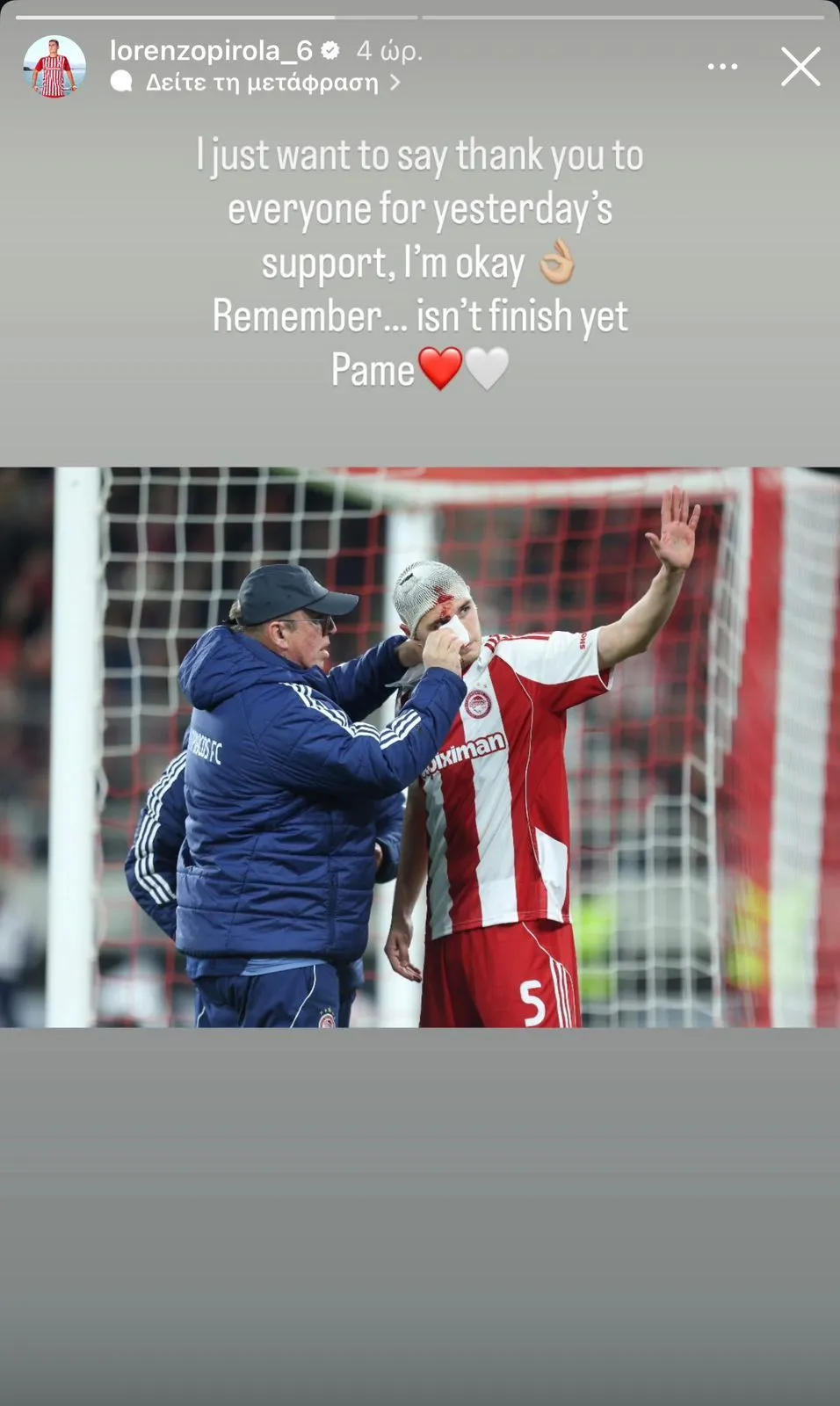 Ο Λορέντσο Πιρόλα ανέβασε story μέσω του οποίου ευχαρίστησε τον κόσμο του Ολυμπιακού για τη στήριξη και τόνισε πως τίποτα δεν έχει τελειώσει στο ζευγάρι με τη Λεβερκούζεν.
