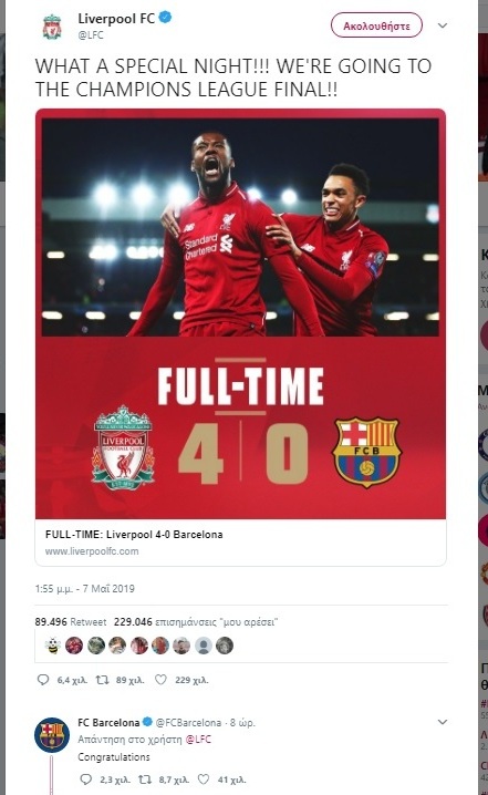 Δύο τεράστιες ομάδες. Η Λίβερπουλ πανηγυρίζει και δείτε τι έκανε η Μπαρτσελόνα