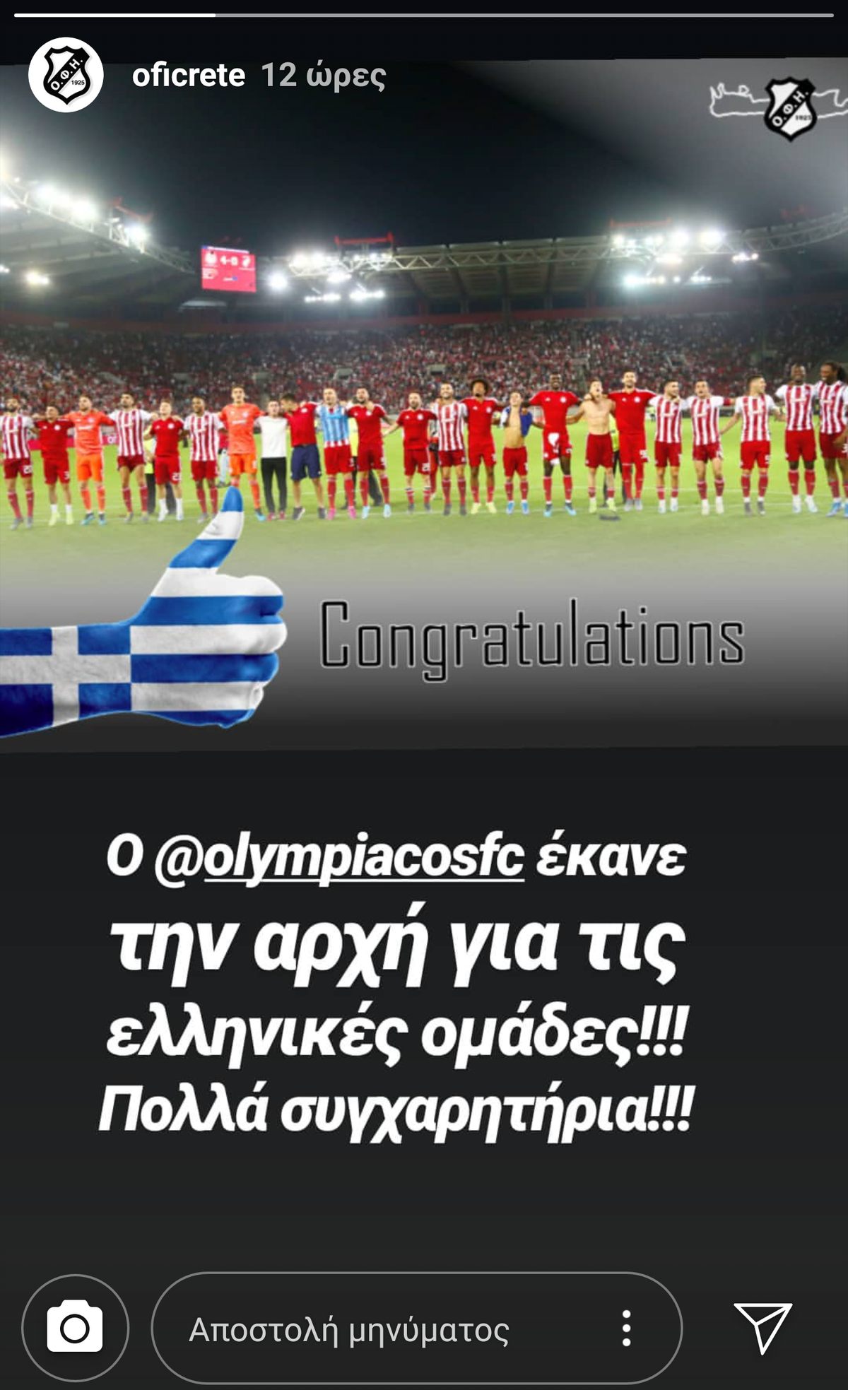 Ο ΟΦΗ έκανε το... αυτόνοητο και συνεχάρη την ομάδα του Πειραιά για την επιτυχία της, ανεβάζοντας ιστορία στο instagram.