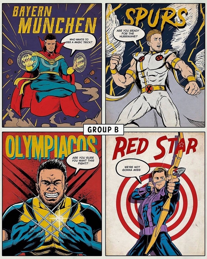 Σε αυτό του Ολυμπιακού, παρομοίασαν τους Πειραιώτες με τον Wolverine των XMEN, την Μπάγερν Μονάχου με τα... μαγικά του Doctor Strange, την Τότεναμ σε ρόλο Storm από τους XMEN, κάνοντας λογοπαίγνιο με τον "τυφώνα" Χάρι-Κέιν, ενώ ο Ερυθρός Αστέρας παρομοιάστηκε με τον τοξοβόλο Χόκι από τους Avengers.