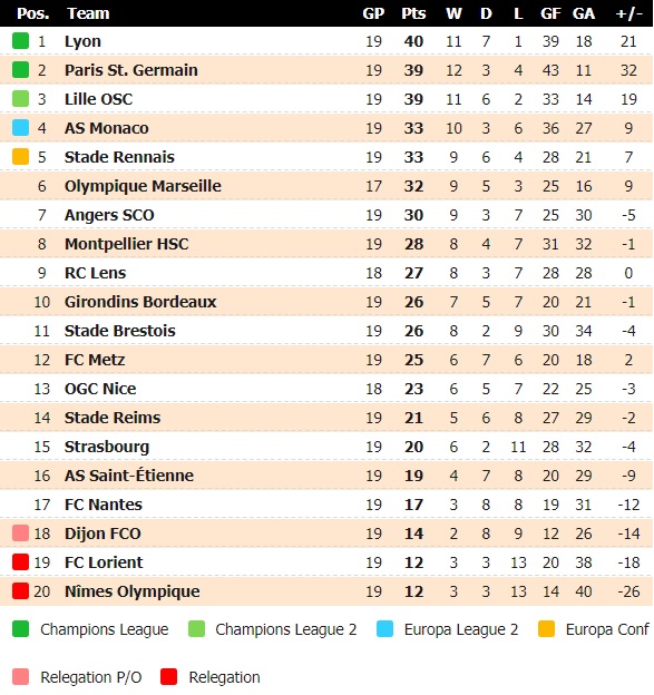 Η δε Λιόν έχασε μεν έδαφος, ωστόσο διατηρήθηκε στην κορυφή της βαθμολογίας χάρη στην ισοπαλία που απέσπασε στην έδρα της Ρεν με σκορ 2-2. Μάλιστα, για να αποφύγουν την ήττα, οι «γκον» χρειάστηκαν δύο γκολ στο τελευταίο δεκάλεπτο του αγώνα!