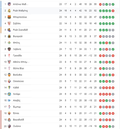 Eν τω μεταξύ η Ουέσκα του Δημήτρη Σιόβα (βασικός κι αναντικατάστατος) επικράτησε μ' ανατροπή της Γρανάδα 3-2 και παρότι ουραγός αναζωπύρωσε τις ελπίδες παραμονής αφού η σωτηρία απέχει μόνο δύο πόντους μετά την πρώτη της επιτυχία έπειτα από δύο σερί ήττες.