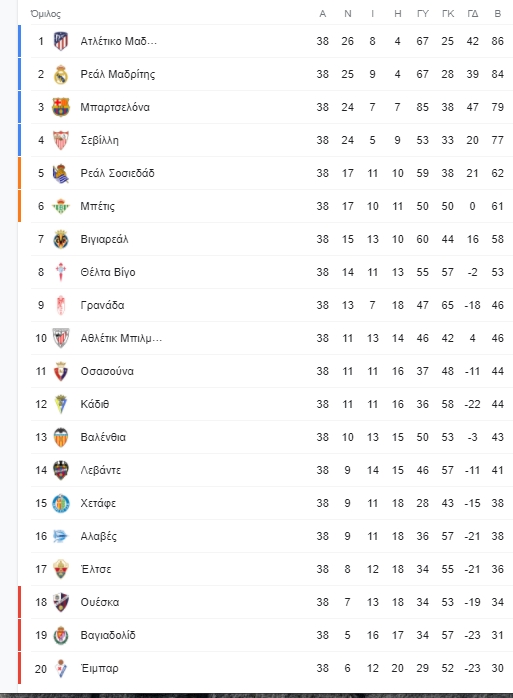 Στον θρόνο της La Liga ανέβηκε ξανά η Ατλέτικο Μαδρίτης ύστερα από επτά χρόνια αναμονής (τελευταίος της τίτλος τη σεζόν 2013-2014), κατακτώντας το 11ο πρωτάθλημα της ιστορίας της χάρη στο διπλό που πέτυχε στο Βαγιαδολίδ!