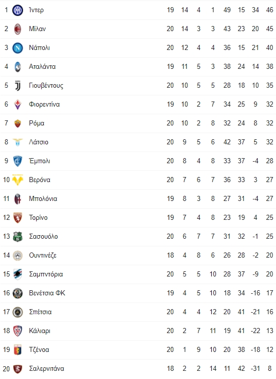 Τα αποτελέσματα και το πρόγραμμα της 20ης αγωνιστικής της Serie A: