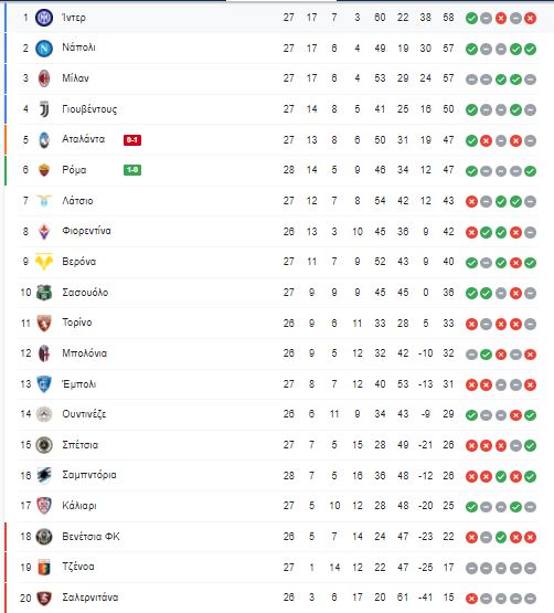 Από την πλευρά της η ομάδα του Γκασπερίνι δεν μπόρεσε πάρει κάτι από αυτό το παιχνίδι με αποτέλεσμα να αισθάνεται την "καυτή" ανάσα των Ρωμαίων που τους πλησίασαν στους τρεις βαθμούς, ενώ οι "μπεργκαμάσκι" κινδυνεύουν να απομακρυνθούν κι άλλο από την τέταρτη θέση. Η Αταλάντα προσπάθησε στο τέλος να ισοφαρίσει, αλλά δεν τα κατάφερε, ενώ ολοκλήρωσε το παιχνίδι με δέκα παίκτες λόγω αποβολής του Ντε Ρουν στο 90+4. Με δέκα έμεινε και η Ρόμα στο 90+6 λόγω αποβολής του Μικιταριάν.