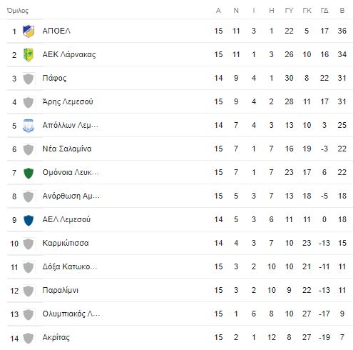 Στην πρώτη θέση του κυπριακού πρωταθλήματος ανέβηκε ο ΑΠΟΕΛ. Μετά τη νίκη με 2-1 επί της Πάφου η ομάδα του Βλάνταν Μιλόγεβιτς νίκησε και την Ανόρθωση με σκορ 1-0 και οδηγεί την κούρσα.