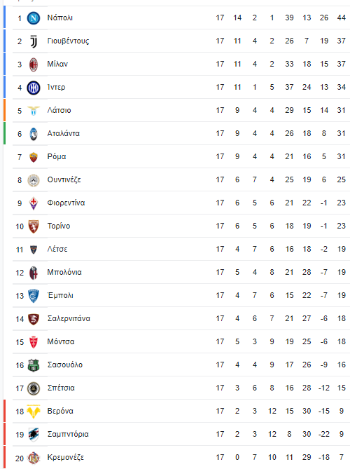 Οι «παρτενοπέι» συνεχίζουν να απολαμβάνουν τη μοναξιά της κορυφής στην κατάταξη, ωστόσο έχουν επτά βαθμούς διαφορά από τους δεύτερους «μπιανκονέρι», οι οποίοι φιλοδοξούν να την «ψαλιδίσουν» ακόμα περισσότερο. Σημειώνεται ότι η Νάπολι παραμένει αήττητη στο «σπίτι» της για το πρωτάθλημα από τον περασμένο Απρίλη, ενώ η «Γηραιά Κυρία» μετράει ένα νικηφόρο σερί οκτώ αγώνων, το οποίο φυσικά φιλοδοξεί να διευρύνει.