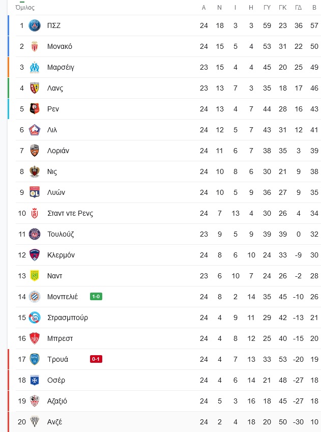 Τέλος, η Μονπελιέ νίκησε 1-0 της Τρουά με τον Καζρί να σκοράρει στο 90’.