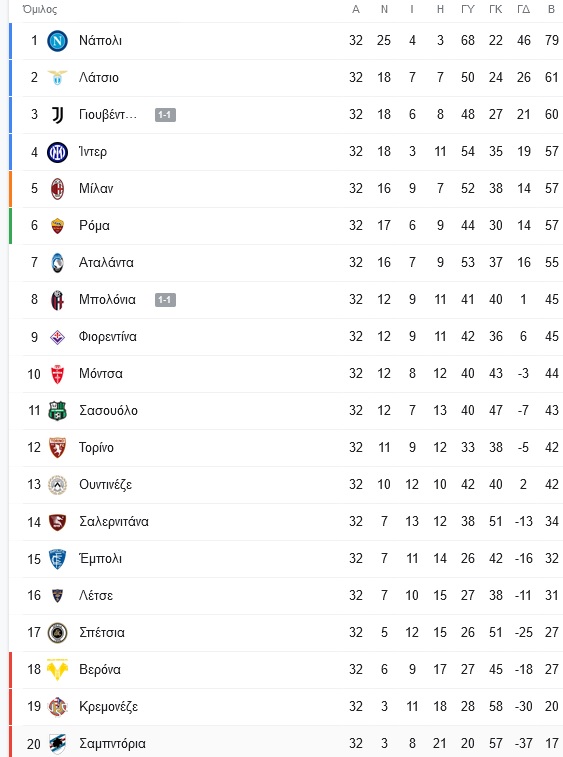 Η Γιουβέντους έμεινε στο 1-1 με την Μπολόνια και έχασε την ευκαιρία να απομακρυνθεί στην πρώτη τετράδα της Serie A. Τα αποτελέσματα της 32ης αγωνιστικής και η βαθμολογία.