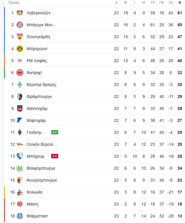 Η Στουτγκάρδη έμεινε στο 1-1 με την Κολωνία και έχασε την ευκαιρία να απομακρυνθεί στην πρώτη τετράδα της Bundesliga. Πάρτι για την Γκλάντμπαχ, που διέλυσε 5-2 την Μπόχουμ. Τα αποτελέσματα της 23ης αγωνιστικής και η βαθμολογία.
