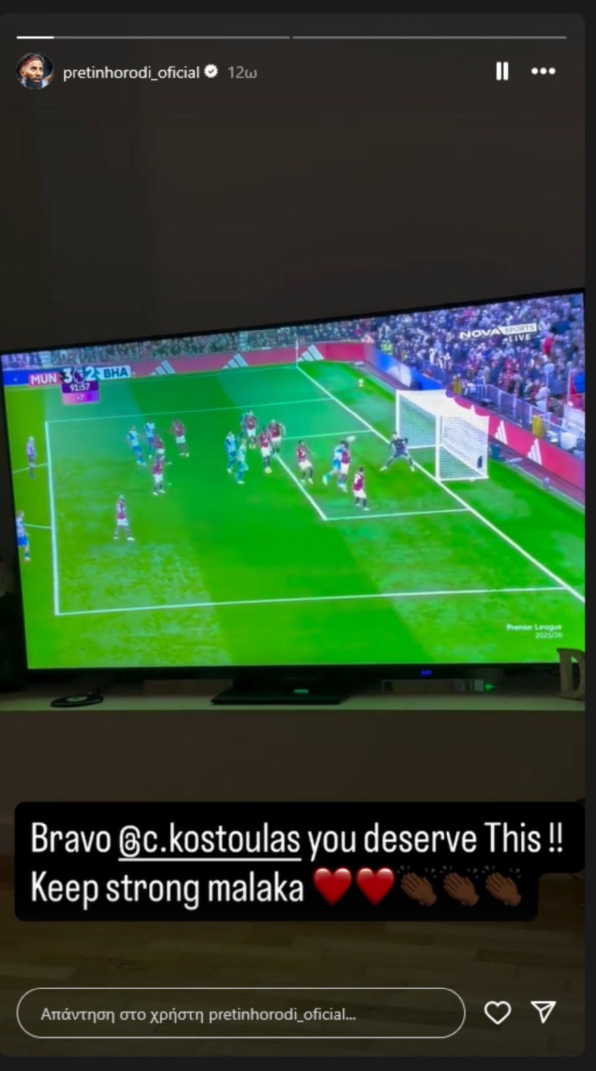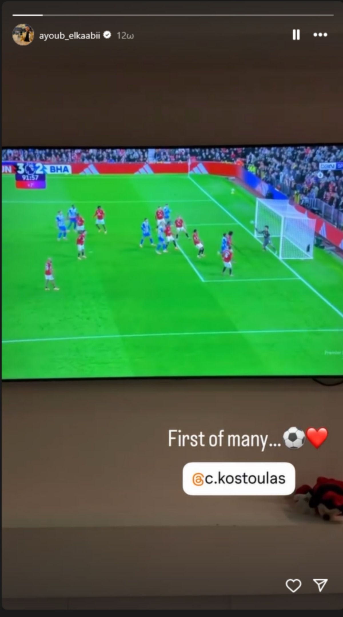 Παρά την ήττα με 4-2 από τους Κόκκινους Διαβόλους, ο νεαρός επιθετικός της Μπράιτον πέτυχε το πρώτο του γκολ στην Premier League. Με μια κεφαλιά - δυναμίτη, ο Κωστούλας μείωσε σε 3-2 στο τρίτο λεπτό των καθυστερήσεων, πριν διαμορφώσει το τελικό 4-2 ο Εμπεμό.