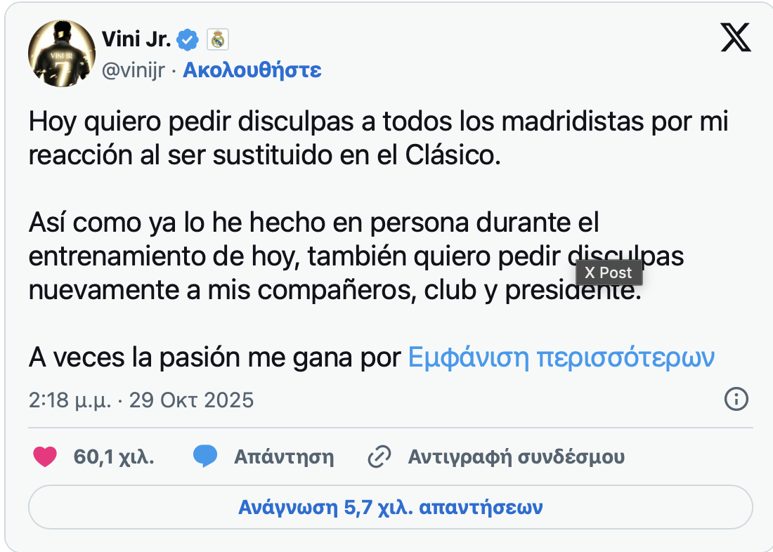 Συγγνώμη ζήτησε από τους οπαδούς της Ρεάλ Μαδρίτης, τους συμπαίκτες του και τον προέδρο της Ρεάλ Μαδρίτης (Φλορεντίνο Πέρεθ) ο Βινίσιους σε ανάρτησή του στα social media.