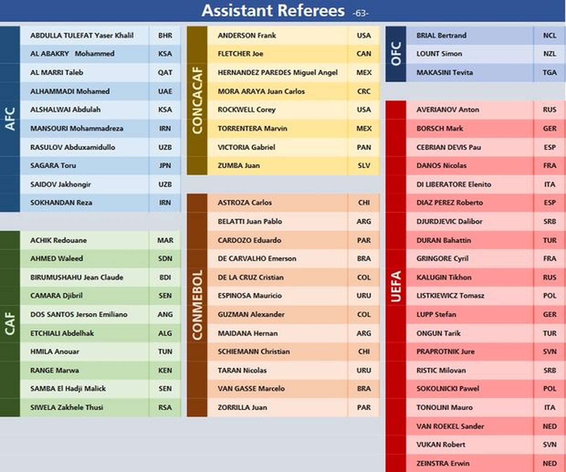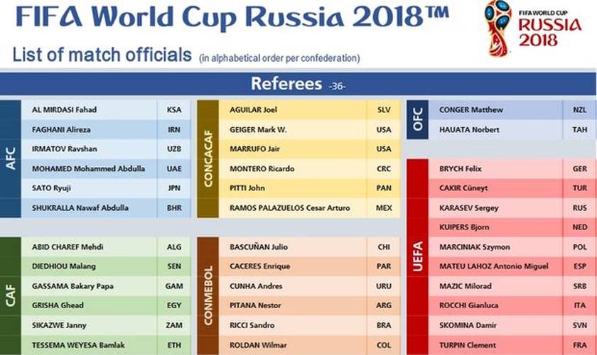 Οι 13 ευρωπαίοι διαιτητές που θα πάνε στη Ρωσία είναι οι Φέλιξ Μπριχ (Γερμανία), Τσιουνέιτ Τσακίρ (Τουρκία), Σεργκέι Καράσεβ (Ρωσία), Μπιερν Κάιπερς (Ολλανδία), Σίμον Μαρτσίνιακ (Πολωνία), Μιγκέλ Αντόνιο Ματέου Λαόθ (Ισπανία), Μίλοραντ Μάζιτς (Σερβία), Τζανλούκα Ρόκι (Ιταλία), Ντάμιρ Σκόμινα (Σλοβενία) και Κλεμέν Τιπρέν (Γαλλία).