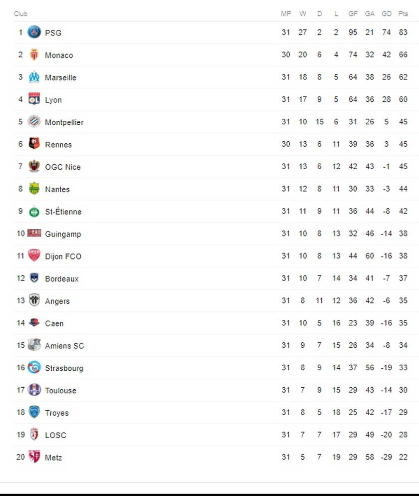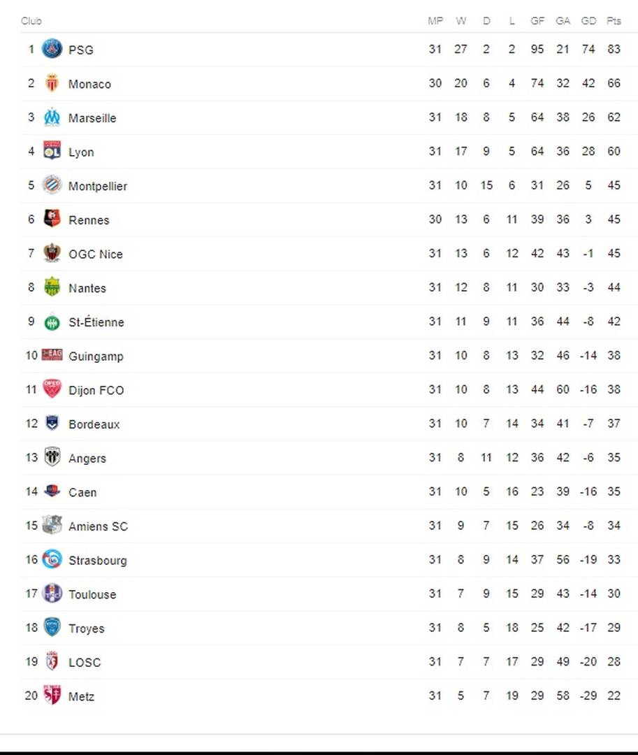 Στους αγώνες της 31ης αγωνιστικής του γαλλικού πρωταθλήματος σημειώθηκαν τα εξής αποτελέσματα: Ντιζόν – Μαρσέιγ 1-3, Γκινγκάμπ – Μπορντό 2-1, Καέν – Μονπελιέ 1-3, Λιλ – Αμιέν 0-1, Ναντ – Σεντ Ετιέν 0-3, Στρασμπούρ – Μετς 2-2, Τρουά – Νις 0-2.