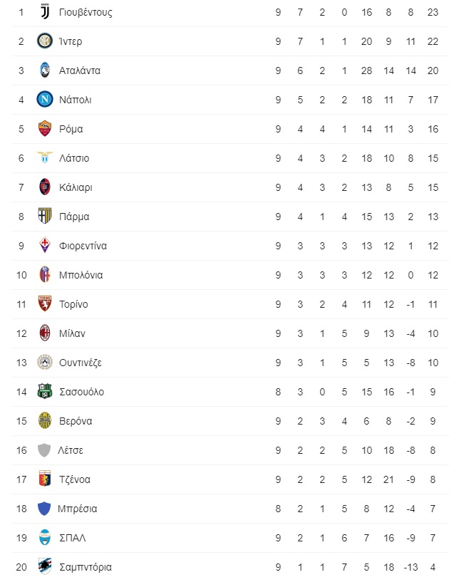 Αταλάντα-Ουντινέζε 7-1 (21', 43' Ίλισιτς, 35' πέν., 47', 75' πέν. Μουριέλ, 52' Πάσαλιτς, 83' Τραορέ - 11' Οκάκα)