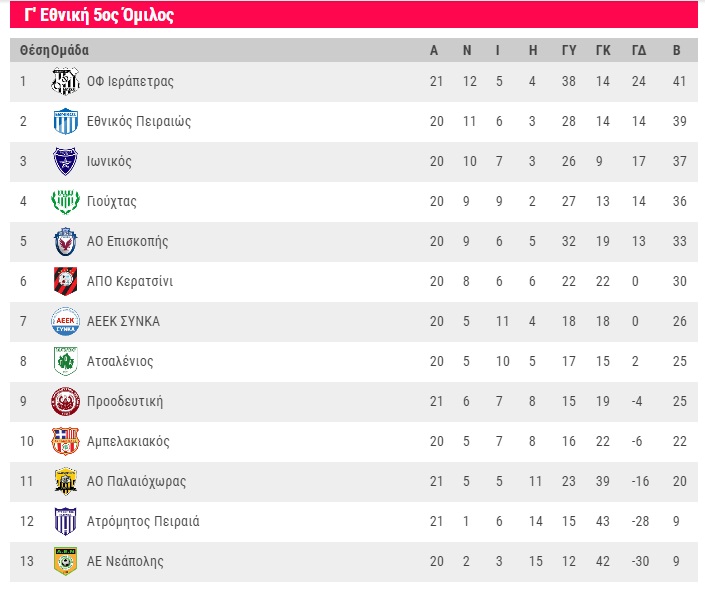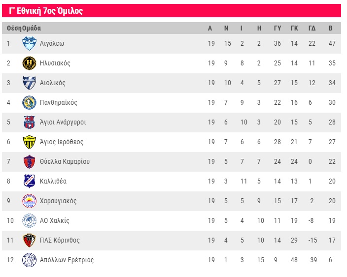 Η επόμενη αγωνιστική (20η 24/3 15.00): Ηλυσιακός – Χαραυγιακός, Άγιος Ιερόθεος – Αιγάλεω, Κόρινθος – Θύελλα Καμαρίου. Πανθηραϊκός – ΑΟ Χαλκίς, Άγιοι Ανάργυροι – Αιολικός, Απόλλων Ερέτριας – Καλλιθέα
