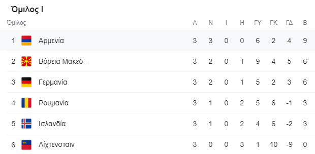 Ισόβαθμη των Αρμένιων η Γερμανία με το 1-0 στο Βουκουρέστι επί της Ρουμανίας, ενώ η εντυπωσιακή Β. Μακεδόνια επικράτησε 5-0 και πήρε τους πρώτους της πόντους κόντρα στο άποντο Λιχτενστάϊν.