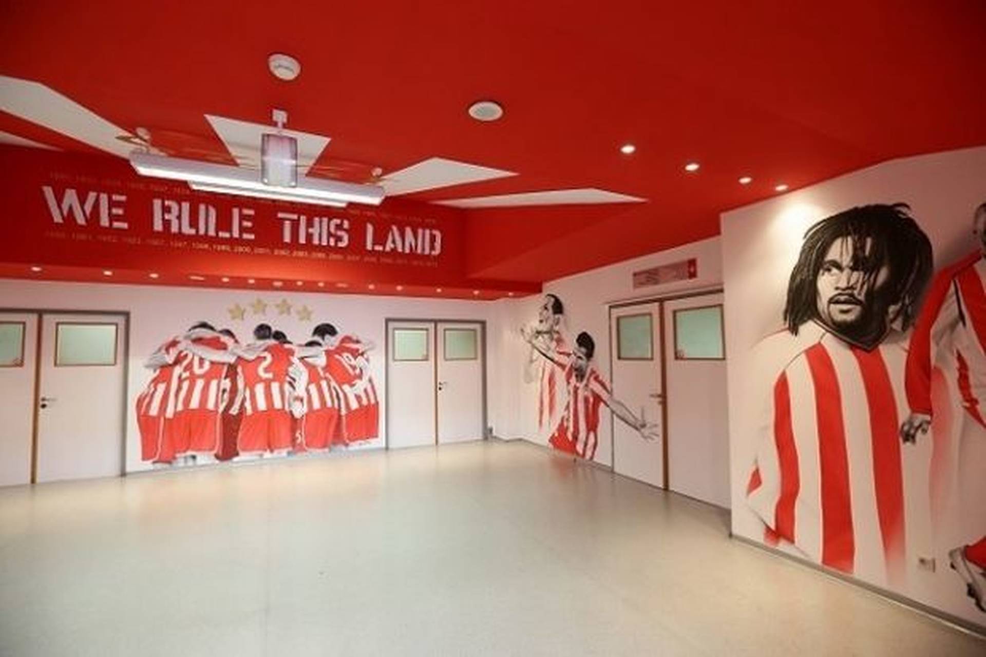 Τα αποδυτήρια των φιλοξενούμενων στο «Γ. Καραϊσκάκης» φέτος έχουν πολύ ερυθρόλευκο χρώμα. Οι Πειραιώτες έχουν φροντίσει να βάζουν τους αντιπάλους τους από νωρίς στο κλίμα, αφού στους τοίχους των αποδυτηρίων φιλοξενούνται τοιχογραφίες με εικόνες της Θύρας 7, εντυπωσιακά κορεό που έχουν κατά καιρούς παρουσιάσει οι φίλοι του Ολυμπιακού, πυρσούς και μπόλικη δόση από την ορμή που δίνουν οι φίλοι του Ολυμπιακού στην ομάδα.